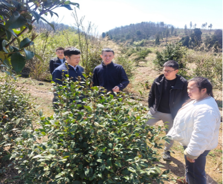 随后,在杨兰天及村干部引导下,调研组实地考察了雷公田村集体产业——油茶种植基地。马力一行深入林地察看油茶树长势,与基地负责人深入交流,详细询问种植规模、日常管护、资金投入、产量效益、市场销售及利益联结机制等情况,对该村因地制宜发展油茶产业、壮大村集体经济的做法表示赞赏。